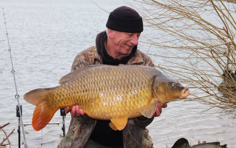 De voorspellingen voor de week erna zijn verre van ideaal. Natte sneeuw, een wind die koud aanvoelt en die de dagtemperatuur van 4 á 5 graden laat aanvoelen als nét boven nul. Toch voer ik op de zondagochtend enkele handjes voorgeweekte boilies op mijn kanaalstek. De planning is om op woensdag een nachtje te gaan doen. Het zal nergens echt los gaan met deze weersomstandigheden, dus het enige wat ik kan doen is proberen om vooraf wat aan gewenning te doen. Ook op maandag-, dinsdag- en woensdagochtend voer ik enkele handjes op relatief kleine plekjes. Het is alleen dat het elke ochtend kouder voelt en met elke boilie die ik erin gooi, vraag ik me dan ook af of het niet teveel is. “Vanavond zullen we het weten”, zeg ik tegen mezelf als ik de laatste boilies erin gooi. Ik ben halverwege de middag op de stek en zit mét mijn kachel in de tent. Het voelt zuur aan buiten en het vertrouwen op een vis is laag. “Thuis vang je ze niet”, zei ik vroeger altijd en natuurlijk is dat ook zo. Toch zit ik de hele nacht voor “de kat zijn viool” en in de ochtend post ik een nachtelijke foto op Facebook met een opmerking naar Geert Ooms dat zijn wakers niet werken. De hele nacht hebben ze niet bewogen. Nét als vorige week komt ook nu vlak voor de tijd dat ik wil gaan opruimen de verlossende aanbeet. De hengel in de vaargeul loopt af en even later kan ik het net onder een hoge schub schuiven. De vis flirt met de dertig pond grens, maar blijkt één ons tekort te komen. Maakt niks uit, want ik heb alweer geen blank. Ik ga hier nog even door want er komt elke week vis op de kant van deze stek. Het enige nadeel is de hondenstront. Beide laarzen en mijn Crocks zaten weer onder. Als ik thuis ben aangekomen, belt Bjorn. Hij vraagt of ik nog iets gevangen heb en als ik daar positief op antwoord is hij enthousiast. “Je gaat lekker ouwe!” Ja inderdaad maat, ik mag zéker niet mopperen.